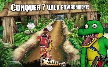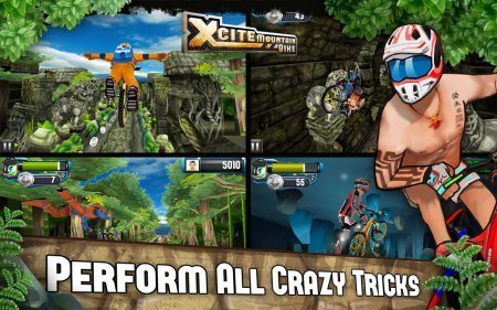 Xcite Mountain Bike – непростой раннер с уклоном в спорт на системе андроид. Тебе нужно перемещаться на велосипеде по представленным джунглям и копить монетки, при этом в длительных скачках исполнять разноплановые фишки. Для этой цели исполняй комбинацию, которая возникнет на дисплее. Вся твоя дорога будет лежать сквозь семь разноплановых местностях с двадцатью разными преградами, к примеру, как бревна, обрывы, узенькие проезды и не только это. По пути преодоления ты изучишь восемнадцать разнообразных фишек, большую часть из них применяют профи велосипедисты. А еще в проекте есть возможность переодеть собственного игрока, либо приобрести ему новенький байк.