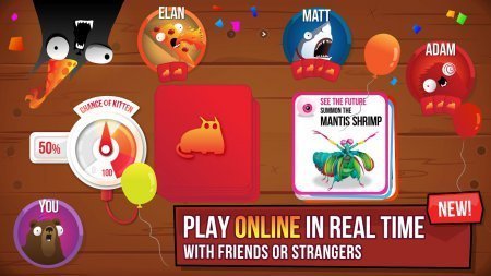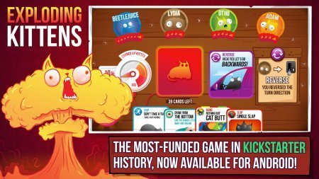 Exploding Kittens – Official – виртуальная версия настольной карточной игры, которая надела шумихи благодаря истории с Кикстартером. Вы сможете играть как онлайн так и оффлайн со своими друзьями или же незнакомцами до пяти человек. Ваша задача, как и остальных участников, вытягивать карту, пока на руки не выпадет карта со взрывающимся котенком. Если же она попалась, то вы либо взрываетесь, т.е. выбываете с игры либо продолжайте играть так как у вас есть на руках обезвреживающая карта. Так же в игре предусмотрены карты, которые влияют на перемещение или же на уклонение с облегчительным исходом от взрывающих котят и другие. Участвуйте в карточных баталиях, создав собственную стратегию победной игры!
