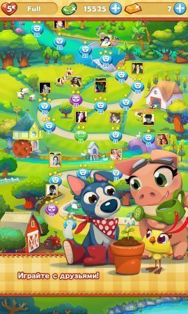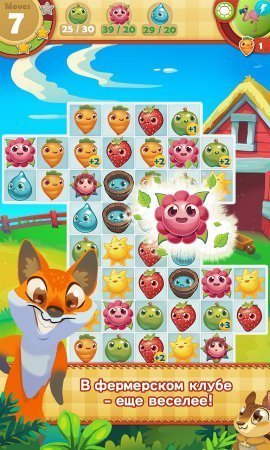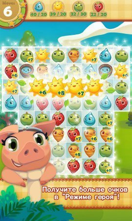 Farm Heroes Saga – занимательная головоломка по тематике три в ряд на систему андроид. Игрушка в образе красочной логической игры, в которой в образе фишек на игровом поле представлены фрукты. Еще в игре расположены разнообразные животные фермы. Игрушка сохраняет довольно красивую и сочную графику, что довольно позитивно влияет на решение ваших дорогих деток. А широкий выбор уровней затянет вас на долгое время, так что запасись свободным временем.