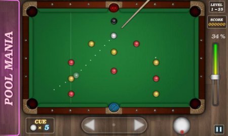 Pool Mania – игрушка на системе андроид, для тех кто любит играть в бильярд, теперь она и в твоем телефоне. Манящая игрушка, в которой ты будешь играть все личное время, чтобы тебе начислили три звезды за преодоленные уровни. Простое руководство придет тебе по душе, и понравиться также и новичкам в данном деле. Преимущества – сто двадцать уровней, парочка игровых режимов, подходит под любую возрастную категорию и легкая в применении, разнообразные лидерские таблички.