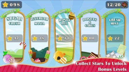 Candy Bang Mania – сладенький проект на базе андроид, где тебе необходимо пройти с конфетой по разным ступеням игры. В данной игрушке вы оказываетесь в мире, который наполнен сладкими вкусностями, где тебе предстоит взрывать всевозможные приспособления, для того чтобы провести конфетку сквозь все представленные ловушки и страшные уровни. Используйте умения конфетки хвататься за представленные стенки, платформы и прочие возможные объекты, чтобы скорее окончить уровень и раскрыть новые, не изменяя сам интерфейс. Для того чтобы заработать побольше достижений и еще бонусов преодолевай уровень за минимальные перечень ходов и самих передвижений, уходи от всех преград. Далее тебя ожидает свыше сотни уровней на пяти разнообразных планетах и простенькое руководство благодаря единому прикосновению. Игрушка, увы, не русифицирована.