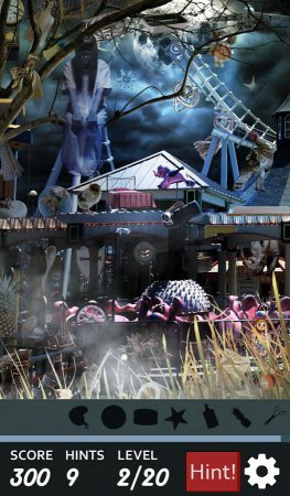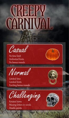 Creepy Carnival -- игрушка направлена на поиск предметов со страшными сценками карнавала. В твой городок прибыл карнавал, но он вызывает у тебя не веселье, а только страх и панику. В таких двадцати сценах тебе нужно отыскивать спрятанные частички, которые меняются каждый раз, когда ты начинаешь игровой процесс с начала. В данном проекте тебя ждет четыре варианта поиска частичек -- найди предметы на картинках, ищи предметы по тени, по перечню слов и вообще случайные выбор вышеперечисленных способов. А еще определи более понравившийся режим проекта, примени подсказки и смотри за мутантами и монстрами, которые непосредственно тебя будет окружать.