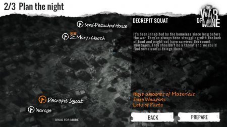 - В начале игры займитесь завалами, чтобы собрать максимум полезных вещей, которые в будущем помогут вам выжить и спасти соратников. Ни в коем случае не используйте инструменты This War of Mine взлома внутри помещения – берегите имеющийся инвентарь;