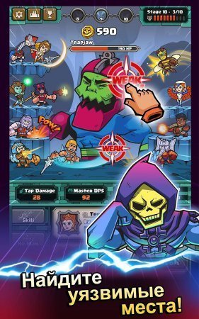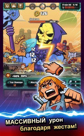 He-Man Tappers of Grayskull – замечательный кликер на системе андроид, в которой ты будешь непосредственно спасать планету от разрухи. Жми на дисплей собственного телефона либо планшета как можно больше раз и наноси отпор толпе скелетов, которые жаждут заполучить мир. Примени помощь союзников, которые сохраняют удивительные способности и кидай вызов мощным боссам. Скелеты, с которыми тебе необходимо бороться имеют знания мощной магии, которая можешь сделать размер твоего героя больше и тебе будет не просто устранить противника. Перемещайся по разнообразным планетам, а также регионам и спаси всю широкую вселенную. Жми на дисплей и отыщи у скелетиков самые слабые местечки, надавливая на которые ты скорее их можешь устранить. Поднимай по всей галактике старинные артефакты и победи с их применением сильную толпу противников.