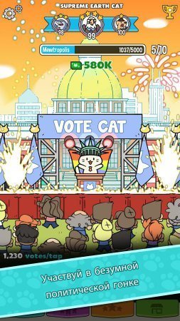 PolitiCats: Free Clicker Game – ощути себя в облике довольно не простого политика. Теперь совершенно не следует смотреть на лица всех данных политиков, играй котенком. Это довольно простенький кликер, но с единой занимательной особенностью. Тебе необходимо не просто улучшать, менять и продвигать собственного котенка, но и бороться на выборах в острых дебатах против прочих политиков. Периодами в качестве босса представленного уровня, тебе необходимо будет больше количество соотношений голосов чем у твоего непосредственного противника. Игрушка довольно легкая, но очень затягивающая. Для игры не нужен интернет и в ней нет русского языка.