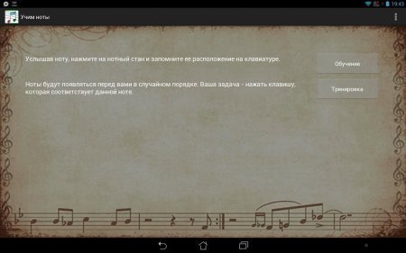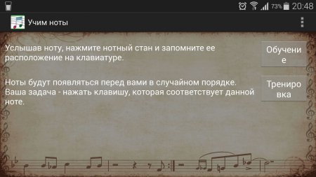 Учим ноты – игра создана для любителей музыки и для тех, кто имеет желание хоть немного разбираться в ней. Данная игра поможет всем обучиться, практиковать свои навыки новичкам, сделать это все можно не выходя из дома, со своего смартфона. Данная игра имеет два раздела, обучение и собственно тренировка. Каждый содержит в себе шесть уровней. Необходимо лишь скачать, установить и приступить к обучению. Совершенствуйтесь, учитесь искусству и желайте узнать новое. Русский язык: да.