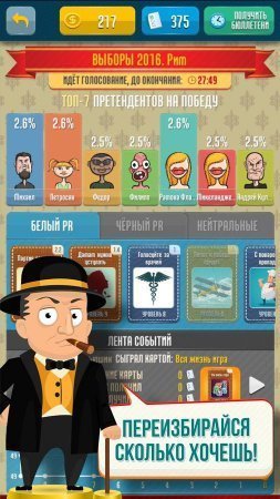 Политических деятелей обслуживает каждый из избирателей, не важно за кото-то проголосовать. Эта заезженная тема практически каждого разговора, которая касается жилых проблемок. Но Симулятор таких себе выборов даст возможность геймеру оказаться с иной стороны и ощутить себя народным любимчиком. Все началось с небольшой и совершенно не известной партии, которая не может победить даже в самой маленькой гонке в отделенной деревушке, но данное положение возможно поменять. Необходимо использовать все возможные технологии пиара и улучшать личную политическую группу, чтобы она была известной между представленными избирателями. Игрушка русифицирована.