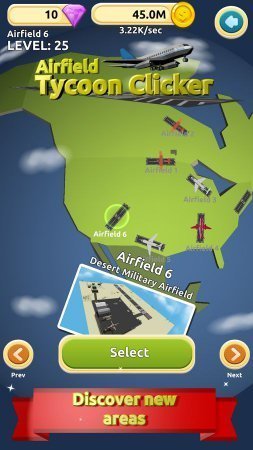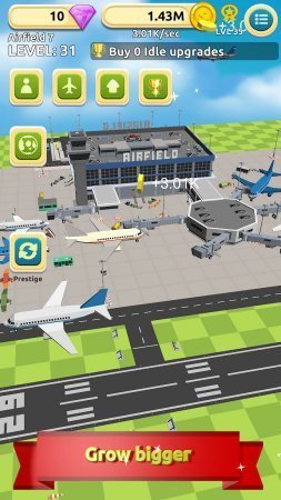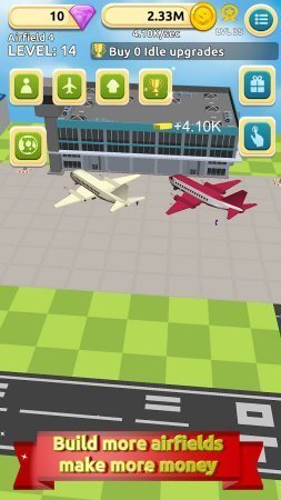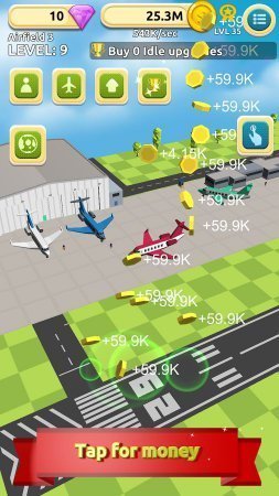Airfield Tycoon Clicker – занятный симулятор на платформе андроид, в ней ты будешь шикарным владельцем большущего аэропорта. Начни с незначительного аэропорта на отшибе городка и увеличь его к неимоверным размерам, нажимая как можно почаще по дисплею собственного устройства не важно телефон это или планшет. Продемонстрируй на практике скорость собственных пальчиков и получи денежки, вкладывая их в развитие собственного аэропорта. Потрать денежки на покупку новеньких более улучшенных самолетов и установку зданий разнообразного назначения. Найми на работу хороший, опытный персонал и принимай еще больше себе денежек. Раскрой себе новенькие локации и выстраивай иные аэропорты. Игрушка не русифицирована.