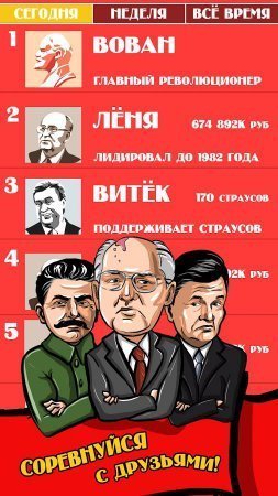 Казнокрад: Деньги и Власть – симулятор на андроид, где вы обладаете возможностью быть растратчиком и параллельно стать генсеком КПСС. В этой игре вам откроется отличный шанс стать самым влиятельным и состоятельным человеком и самому попытаться разрушить СССР. В этом симуляторе вам предстоит направиться в далекие девяностые и станете питать свои силы из государственного казначейства, влаживая свои наличные в различные дела и воплощая великих правителей в своё послушное орудие. Все знаменитые главнокомандующие, такие как Ленин, Сталин, Андропов и Брежнев покорятся перед вашей силой и деньги с их изображениями посыпятся в ваши кошельки. Превратитесь в самого могущественного тирана тех времен и создайте свою денежную республику. Почувствуй себя в роли разрушителя СССР! Русский язык: поддерживается.