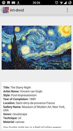 Art-droid – если ты творческая личность и тебе нравиться живопись во всех ее возможных видах, тогда данный проект непосредственно для тебя. В едином месте сохранен не малый перечень картин от различных художников со всех участков шикарной планеты. Приготовлены все жанры живописи, так что любители искусства могут просто часами разглядывать разносторонние картины и восхищаться умением и талантом известных художников. Преимущества игрушки – широкая база картин которая набрана из всего мира, приготовлены художники из различных уголков, преимущество перед шикарными галереями в сохранности возможных холстов, преимущественные картины постоянно рядом. И самое главное приложение совершенно бесплатное. Проект не русифицирован.