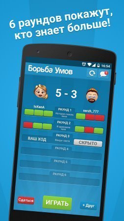 Борьба умов на андроид – соревновательного вектора головоломка социального ориентирования, включающая двадцать тысяч вопросов на тему географии, математики, логики, прочих дисциплин школьного уровня. Высокое качество анимации, потрясающие звуковые эффекты, тематические вопросники – всё это головоломка, рецензируемая строками текущей статьи. Проходите уровни, соревнуйтесь с друзьями, знакомыми, коллегами, однокурсниками. Отвечайте на вопросы простого, среднего и сложного статуса, устраивайте самостоятельные чемпионаты с приглашением соперников из числа зарегистрированных в социальных сетях друзей. Завершив первый этап, начните второй раунд с вновь прибывшими новоиспеченными игроками, которые подготовились к отчаянной схватке заблаговременно.