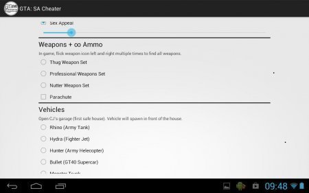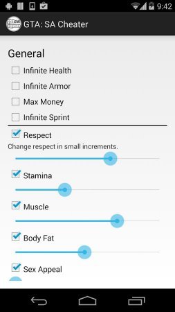 GTA: San Andreas Cheater -- программка на базе андроид которая даст возможность использовать читы к знаменитой игрушке GTA: San Andreas. Все легко перед игровым процессом вписываем коды сберегаем их и наслаждаем игровым процессом с уже отредактированными параметрами твоего героя, но не забывай то играть без читов намного занятней и интересней.
