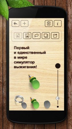 Pyrography -- имитатор выжигания на дощечках на платформе андроид. У массы кого когда-либо был выжигательный аппарат, а некоторые даже еще не забыли этот запах, который расходился по всей комнате, когда ты над чет-то работал. Теперь ты не нуждаешься в электроприборе и доске, все это ты можешь провернуть на собственном устройстве который у тебя имеется. Преимущества -- безграничные возможности которые направлены на творчество. Экспорт твоих шедевров в сети социального характера, фотоальбом, отправь по почте. Шанс разработать подарок дорогому человеку собственным руками.