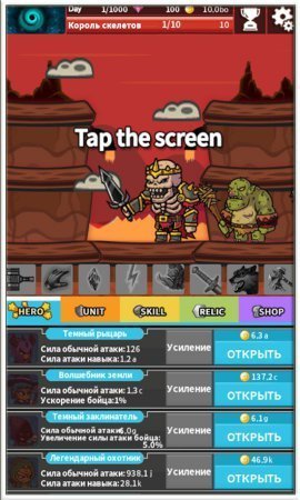 Tap Boss – кликер для андроида. Необходимо противостоять вредным противникам. Монстры и дети тьмы прорвались в реальный мир с планом его уничтожения. Задачей игры является кликаться по экрану, чем чаще, так лучше, чтобы уничтожить всех привратников ада. Используя возможности рекрутов, которые в независимости от ваших действий сами атакуют врагов. Применяя силу древних вещиц, выйдите победителем из этой схватки. Используйте как можно больше ресурсов для усиления своих войск. Русскоязычная версия игры отсутствует. Сражайтесь с врагами, и побеждайте. Не дайте противной нечисти осуществить ее план. В атаку…