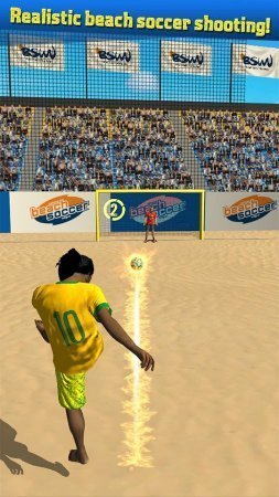 В андроид-игрушке под названием Beach Soccer Shootout действия разворачиваются на самом настоящем бразильском пляже, где вам предстоит сыграть в игру с мячом. Догадались? Да, речь идёт о пляжном футболе. Всё достаточно просто, как и в обычном футболе - нужно забить большее количество голов по сравнению с соперником. Вы будете участвовать в турнирах, соответственно главная задача будет заключаться в итоговой победе. Путешествуя по всему миру, перед вами открывается возможность покорить лучшие пляжи. Вам предстоит руководить неплохой командой, но только с вашей помощью они смогут стать настоящими чемпионами пляжного футбола.