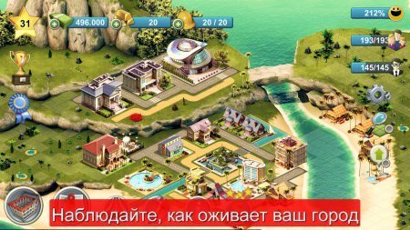City Island 4: Sim Town Tycoon – восхитительная стратегия на систему андроид, непосредственно в которой тебе необходимо качественно построить собственный городок. Выстраивай здания повыше, большущими жилыми районами, а еще заводы, театры, кафе и, конечно же магазины. Совершай все действия для того чтобы твоим жителям было максимально удобно и легко жить. Хорошо просчитывай каждую задумку в городке, в этом же списке и сеть транспорта, развлечения и медицина для твоих людей. Сделай собственный город неимоверным из всех прочих и тогда буду привлекаться и иные люди, новые. Сооруди прогулочные красивые корабли и, конечно же нужно подумать и про сильный флот, они помогут тебе раскрыть соседние острова и расчистить их к проживанию для людей. В данной игрушке тебя ожидает свыше двухсот пятидесяти разносторонних задач, красочная графика и ценные достижения по игре.