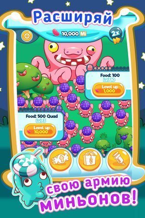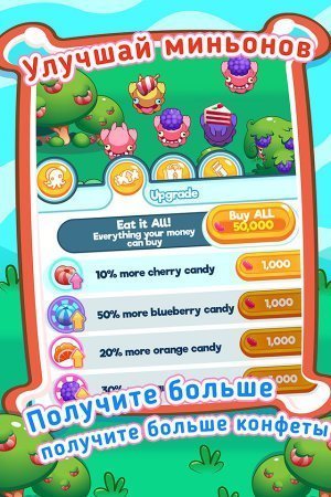 Candy Minion - Idle Clicker - это игра кликер, про приключения конфетных миньонов. У главного миньона - уже урчит в животе, а голодный он вне себя от злости. Необходимо собрать отряд миньонов и отправить его на поиски вкусняшек в конфетный домик. Пригодится все: конфеты, пирожное, печенье, ягоды, всего в игре представлено 30 продуктов. Миньонов необходимо прокачивать, что бы они могли собирать еще больше сладостей для своего Босса. Армия сладких монстриков насчитывает 12 уникальных миньонов. Отряду нужно пройти множество сладких приключений в конфетном домике, чтобы утихомирить голод своего Босса. Игра русскоязычна.