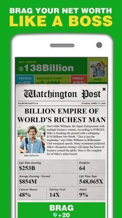 Billionaire – все жаждут быть богатыми. Проект даст возможность осуществить собственное желание. Но помните, что все твои владения будут только виртуальными. Разработай собственный бизнес с самого начала и смотри как он снабжает тебя шикарным доходом. Развивай собственную империю бизнеса и превратись в миллиардера. Проект сам по себе не сложен как некоторые из представленных. Все довольно понятно и не сложно, выстраиваем бизнес и получаем доход, вкладываем прибыль и получи в два раза больше. Соперничай с собственными товарищами, кто из вас сможет больше получить прибыли. Так играть куда веселее и занятней. Игрушка не русифицирована.