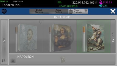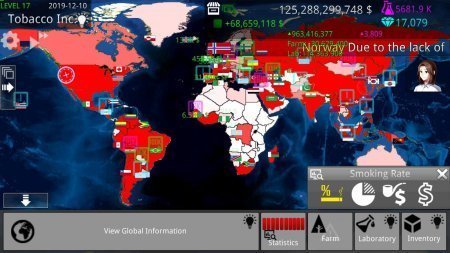 Не обращая внимание на всеобщее противостояние с курением и применяемые меры правительствами для того чтобы уменьшить употребление сигарет, все-таки известные табачные производители по сегодняшний день замечательно развиваются и продолжают развивать такого рода рынок. Tobacco Inc. (Cigarette Inc.) довольно таки реалистично представленный симулятор в котором тебе необходимо выступить в облике главаря табачной компании и стремитесь забрать монополию по реализации сигарет во всем мире. Для этих целей у тебя будет предельно широко раскрыты возможности, кроме экономических и само собой маркетинговых дорог есть шанс применить такие себе сомнительные меры. Выращивание разновидностей выше указанного урожая с самым высоким уровнем привыкания, смешанных сортов и не только это. Но главный удар в проекте стоит все-таки на довольно-таки законные способы улучшения представленной продукции. Так что у тебя будет возможность испытать собственные силы в руководстве компаний в рамках мирового уровня.