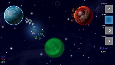 Zingy Space подвижная стратегия на системе андроид, в тематике RTS где ты проследуешь в космические просторы и будешь устранять планеты врагов. В проекте принимаю участие три планеты каждая сохраняет собственный окрас, твоя цель является направлять собственные космические судна к планете врага и устранять ее до того момента пока не устранили тебя. Как только твои судна попадут к орбите, начнется огонь, подстреленные судна разрушатся, но им на подмени приходят иные которые готовы идти в наступление в любое нужное время. Руководство в игрушке довольно ясное, жми на дисплей устройства и направь собственные корабли в бок нажатия.
