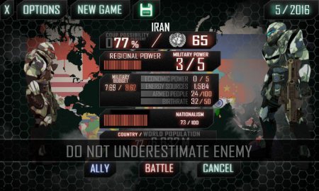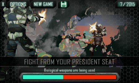 World War 3 -- новенькая мировая борьба опустилась на весь мир и тебе необходимо выбраться из нее победителем. Определи для себя страну и приведи ее к цельной и бесспорной победе. Установи военный бюджет, создай совершенно новое вооружение, установи внешнеполитические нити с прочими странами. Смотри за социальным движением -- перечень населения способно как падать, так и повышаться. Преимущества -- удивительная постепенная стратегия, сто шестьдесят восемь стран и двенадцать уровней мощности, пара игровых режимов, двенадцать воздушных суден.