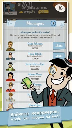 Юмористический проект Adventure Capitalist на андроид показывает доморощенным бизнесменам, как надо вести дела в сатирической, немного развлекательной форме. С помощью анонсируемой программы вы действительно, легко, быстро, непринужденно станете самым богатым человеком с редким навыком управленца. Основой функциональной стороны приложения выступает система заработка зелёных американских долларов с выгодной конвертацией в единицы отечественной валюты – рубли, гривны или казахстанские тенге.