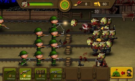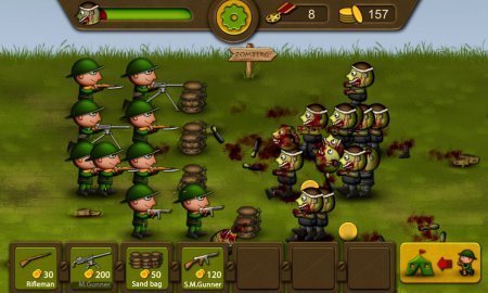Zombie vs Gunman – игрушка, выступающая чем-то средним между тактической стратегии из тематики обороны башен и аркады экшен типа. На первом плане в проекте становятся сражения из тематики стенка на стенку. Как это не удивительно действия начинаются в период зомби апокалипсиса, в период, когда страшный смертельный вирус прошел по планете и бродячие мертвецы взвалили на себя власть в городках и селах. С каждым новым днём перечень нечестии растет и вот противные монстры дошли и до боевой базы. Командиром одной из таких баз тебе и нужно будет стать, а конкретней стать во главе на оборону базы. На твоей стороне будет мощь нового вооружения, танки, укрепления для обороны, а на стороне твоего противника будет преимущество в численности. Да не обращая внимание на отсутствие мозга зомби реально могут получить победу, так как их куда больше.